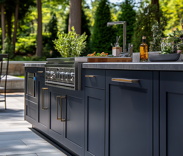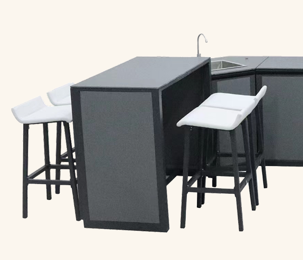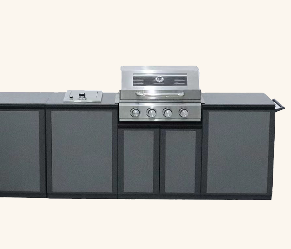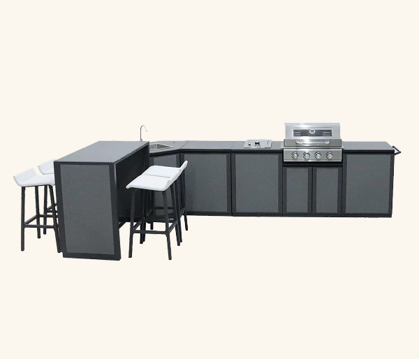 מטבח חוץ פינתי יוקרתי בגימור שחור מט אלגנטי, עשוי מתכת מגולוונת עמידה בתנאי מזג האוויר. כולל גריל גז מקצועי עם 5 מבערים, כיור אינטגרלי, מגירות אחסון נוחות ומשטח עבודה רחב. הפתרון המושלם לניצול חכם של שטח החוץ וליצירת חוויית אירוח ברמה גבוהה.